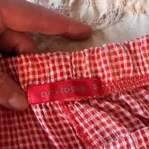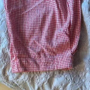 Soft pink gingham pants with an elastic waist. Relaxed fit with tapered legs. Elastic cuffs for a comfy finish. Lightweight and breathable fabric.