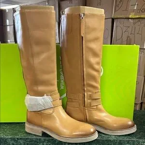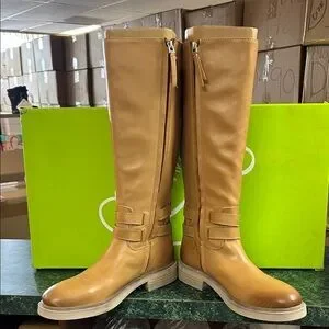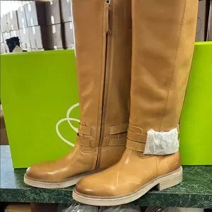 Tall Sam Edelman boots with smooth tan leather-look finish. Side zipper for easy entry. Low stacked heel and rounded toe. Subtle strap detailing at the ankle. Versatile style for everyday wear.