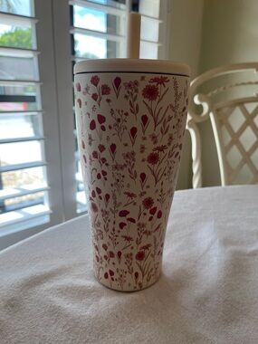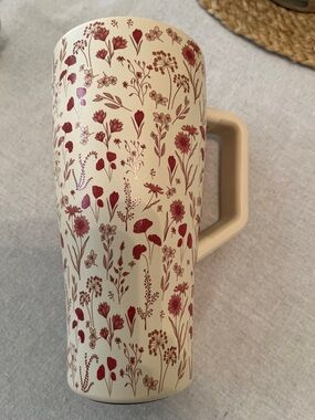 Brumate insulated travel tumbler with lid and straw. Cream base with deep red floral print. Easy-grip handle. Stylish and functional for on-the-go use.