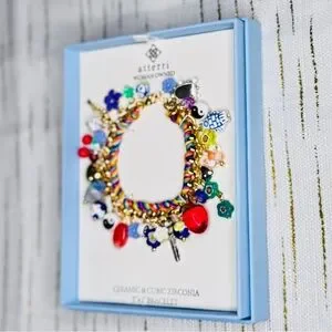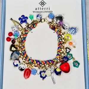 A true statement piece. This Atterri woman-owned charm bracelet features an eclectic mix of ceramic charms, cubic zirconia accents, and a vibrant woven cord base for a bold, playful-luxury look. Designed to stand out, this bracelet delivers major TikTok-core, maximalist energy with layered charms that move beautifully on the wrist.