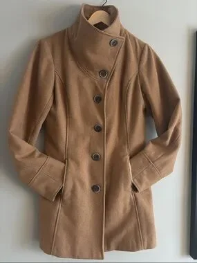 Classic camel women's coat with a high collar and button-front closure. Tailored seams create a flattering silhouette. Soft wool-blend fabric provides warmth and a refined look. Includes discreet side pockets for convenience.