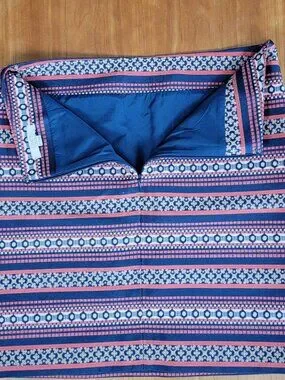 Cute mini skirt in shades of coral, navy, gold and tan. Machine washable, invisible zipper with hook/eye closure, fully lined.