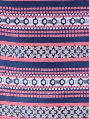 - Aztec Stripe patter in shades of coral, navy, gold and tan