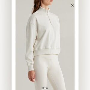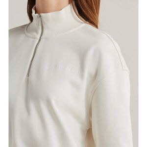 Lightweight cream half-zip pullover. Relaxed fit with ribbed cuffs and hem. Short zip neckline for easy layering. Minimal, versatile design for everyday wear.