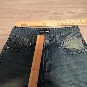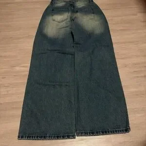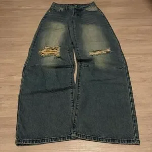 Details: Wide leg fit, baggy silhouette, distressed mud wash denim, Y2K/grunge aesthetic