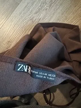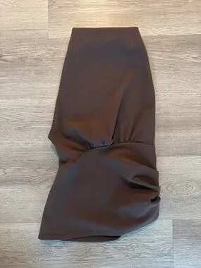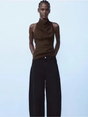 Sleek halter neck with soft drape detail. Fitted silhouette through the waist. Smooth, solid fabric for a minimalist look. Versatile piece for layering or standalone wear.