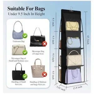 Hanging purse organizer for closet:Each slot measures 9.5 x 5.5 inch; suitable for bags under 9.4 inch in heigh such as underarm bags, small and medium-sized messenger bags, small handbag