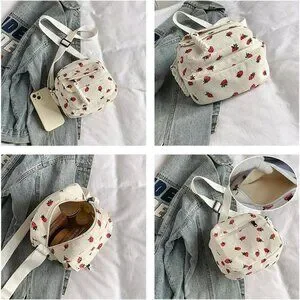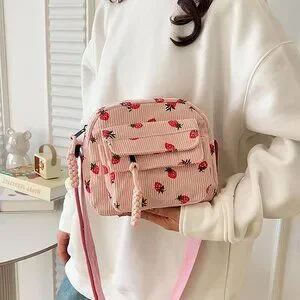 Features: This cute tote bag is made from high-quality corduroy with a canvas lining, making it durable and stylish. The adorable strawberry pattern adds a fun touch. It has a main compartment, a small pocket, and a zipper closure to keep your essentials secure. The wide, thick strap makes it comfy on your shoulder for all-day wear. Perfect for carrying your wallet, phone, makeup, or snacks.