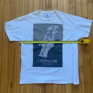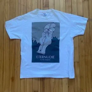 A 1995 Simpsons t-shirt featuring "Eternudie by The Simpsons" graphic. This white Hanes Heavyweight shirt showcases a humorous illustration of Marge and Bart Simpson. It is a great piece for collectors or fans of The Simpsons. Perfect for casual wear, comic conventions, or themed parties.