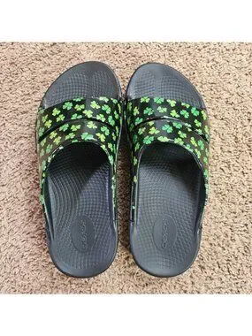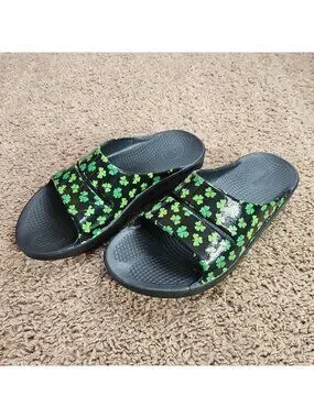 OOFOS OOahh Slide Sandals M9 W11 Sport Recovery Black Shamrock St. Patrick's Day