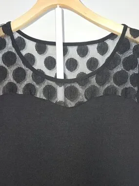 Sleek black cap-sleeve top with a sheer polka-dot mesh yoke. Feminine round neckline and delicate mesh overlay. Lightweight, flattering silhouette for day or evening. Great for a dinner or night out. XS