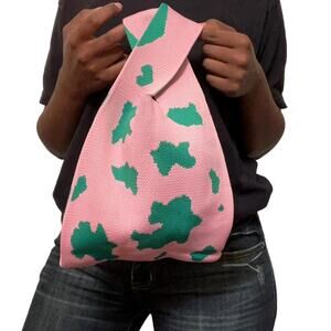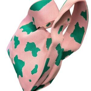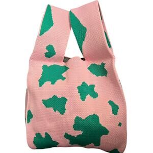 Pink and green cow print tote handle bag