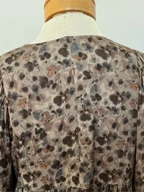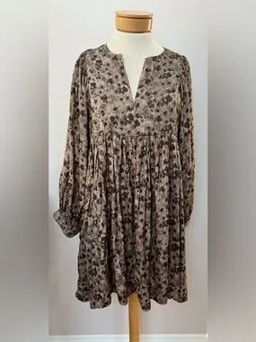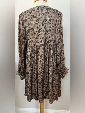 Boho Flowy Babydoll Dress Brown Floral Long Sleeve Mini Peasant Cottagecore