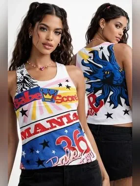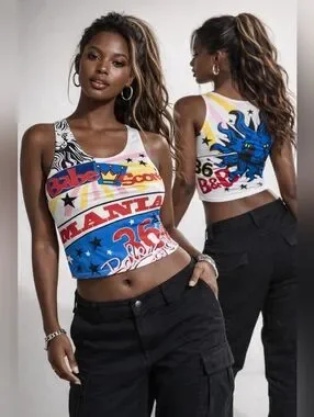 Bold, nostalgic, and unapologetically Y2K—this statement tank from “B” Artistic by Diss Inc brings early-2000s pop graphics to life. Designed with vibrant color-blocking, star motifs, and playful typography, this piece captures that iconic era of expressive, graphic fashion.