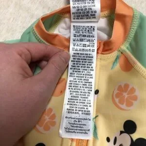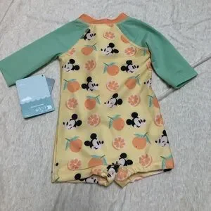 This adorable Disney Baby swimsuit is new with tags, never worn or tried on. Has a couple very small spots on it, I do not know how or what it is, but should come right out with a first wash. Featuring Mickey Mouse and Oranges! Perfect for your next vacation to the parks for Pool Day or a fun Summer season. Comes from a smoke free pet friendly home.