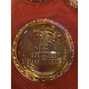 Independence Hall Amber Carnival Glass Commemorative Plate Indiana Glass.