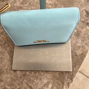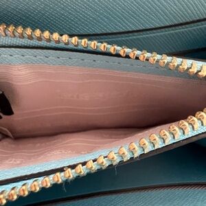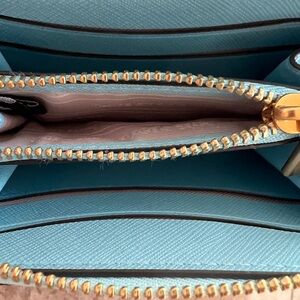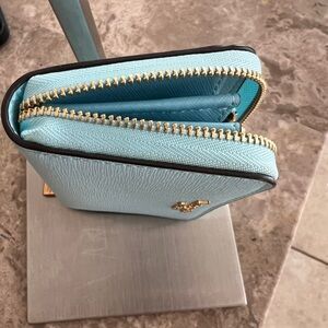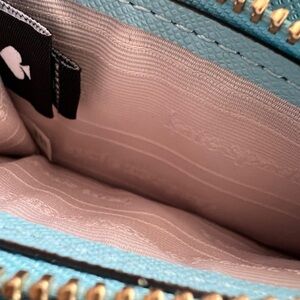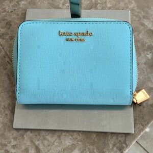 Compact kate spade zip-around wallet in a bright aqua tone. Gold-tone logo and zipper pull add shine. Interior organizes cards and bills neatly. Lightweight and stylish for daily use.