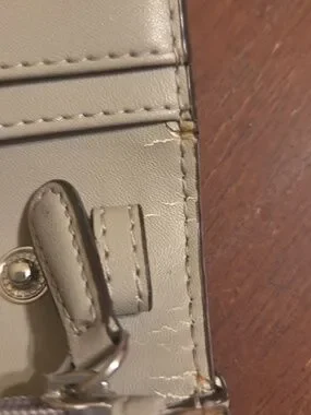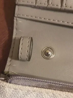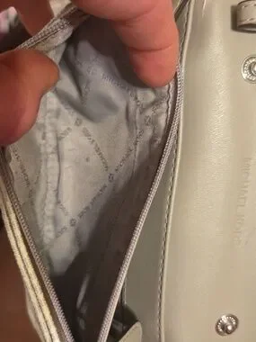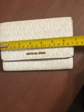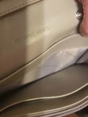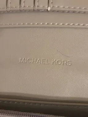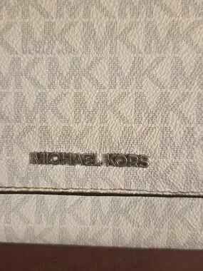 Michael Kors Jet Set multifunctional smartphone crossbody bag in the signature logo vanilla colorway. It is missing the crossbody strap but you could add one. See all pic there is the some wear on inside and a smaller ink mark.