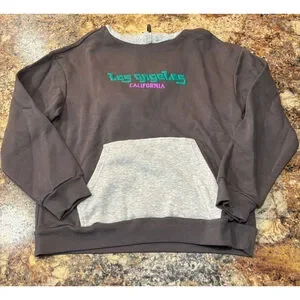 Streetwear-style graphic crewneck by Hybrid Apparel. Charcoal body with a contrasting heather-gray kangaroo pocket. Large neon palm trees + globe + “Los Angeles California” text over a warped checkerboard on the back; small front chest hit. Super soft fleece.
