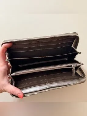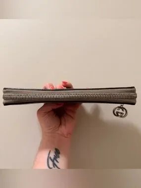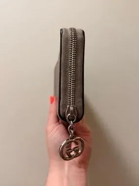 Gucci monogram canvas exterior. Brown tones with tonal GG pattern. Zip-around silhouette for secure storage. Sleek and refined accessory. *Authentic* Gucci - Monogram Zippy Wallet. In great, pre-loved condition. See photos for closer look at condition. Some rubbing on top on inside divider.