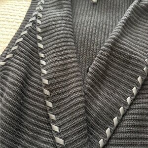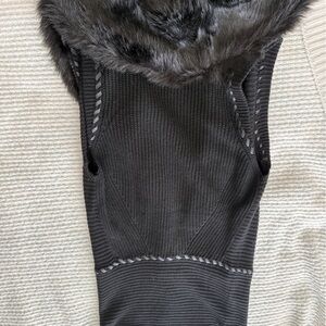 Chic sleeveless knit vest with a plush faux fur shawl collar that can be removed for a completely different look. Faux leather whipstitching provides nice detail. Open-front design for effortless layering. Soft textured knit adds subtle interest. Polished piece for evening or workwear looks. Without the fur, the vest provides a more casual look. Wear with leggings and boots, jeans and cowboy boots or dress it up with cream slacks go an evening out. Can’t beat two outfits for one price!