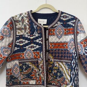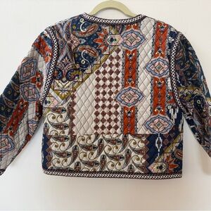 Quilted patterned puffer jacket with vibrant paisley and geometric panels. Contrasting trim along the edges and center opening. Lightweight insulated feel for cool days. Playful mix of colors that pairs with many outfits.