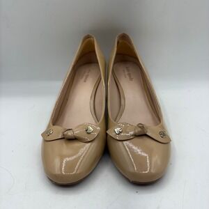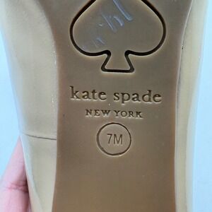 Kate Spade New York pumps in a versatile beige patent leather. These elegant shoes feature a classic round toe and a comfortable mid-height block heel, making them ideal for both office wear and special occasions. The vamp is adorned with a stylish bow detail accented by signature gold-tone spade hardware. Finished with a smooth leather lining and a durable synthetic sole for all-day comfort. There are some minor scuffs on the patent leather as visible in the photos.