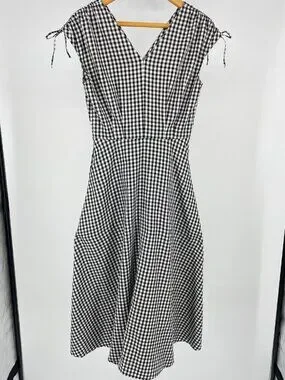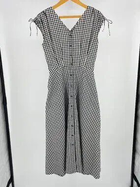 + Notable Details: Classic black and white gingham print; V-neckline; full button-down front; cap sleeves with adjustable ruched drawstring ties; hidden side-seam pockets; fit-and-flare midi silhouette.