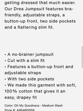 A no-brainer one piece that makes getting dressed that much easier. Our Drea Jumpsuit features bra-friendly, adjustable straps, a button-up front, two side pockets and a flattering slim fit.