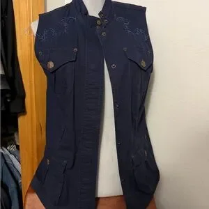 Sleeveless navy utility vest. Front button closure with flap pockets. Embroidered detail on shoulders. Versatile layering piece. Neutral navy color pairs well with many outfits. No belt included but had loops. Smoke free and pet free home. Freshly dry cleaned.