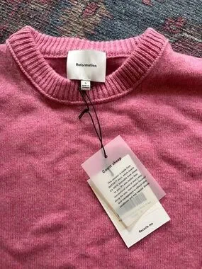 Soft crewneck sweater in a warm pink hue. Ribbed collar, cuffs, and hem. Lightweight knit with a clean, timeless shape. Brand tag visible.