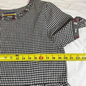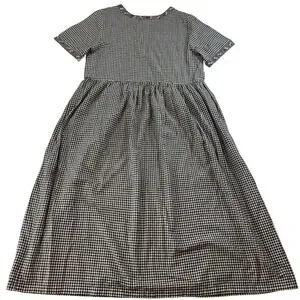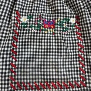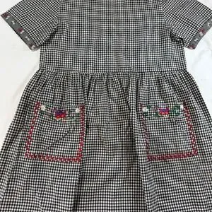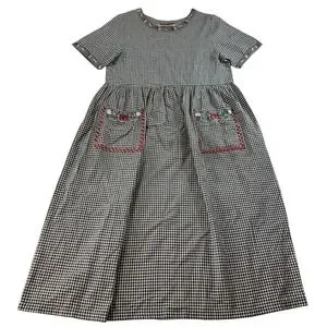 Bryn Connelly vintage cottagecore midi dress crafted from breathable 100% cotton in a classic black and white gingham pattern. This charming piece features intricate floral and butterfly embroidery on the front patch pockets, with coordinating embroidered trim along the neckline and short sleeve cuffs. Designed with a comfortable empire waist and a flowing skirt, it offers a timeless prairie-inspired aesthetic.