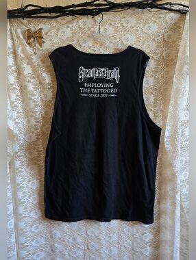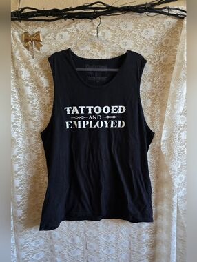 ✧ Black sleeveless muscle tee "TATTOOED AND EMPLOYED". Has
