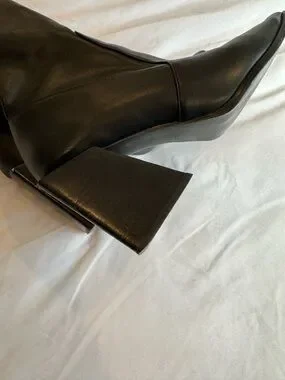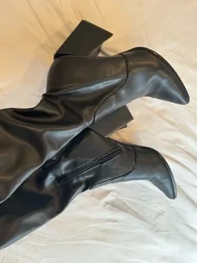 Chic over-the-knee silhouette with a bold block heel. Smooth black upper for a streamlined look. Pointed toe adds a polished touch. Easy to style for day or evening.