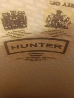 Signature Hunter logo at the top. High-gloss rubber exterior. Tall silhouette with side strap detail. Waterproof design for wet weather. Bold monochrome color.