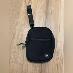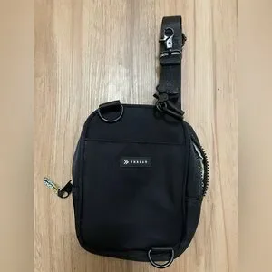 Thread Wallets Black Crossbody Bag with Geometric Pattern Lining. This compact and versatile bag features a durable black canvas exterior with a signature front logo patch. The interior is lined with a unique geometric pattern in yellow, white, and black, including a mesh organization pocket.