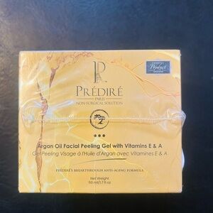 Prédiré Argan Oil Facial Peeling Gel in yellow. Gently exfoliates to remove dead skin and reveal a smoother, brighter complexion. Enriched with argan oil and vitamins E & A to nourish and hydrate. Suitable for regular use to refine skin texture and enhance radiance.
