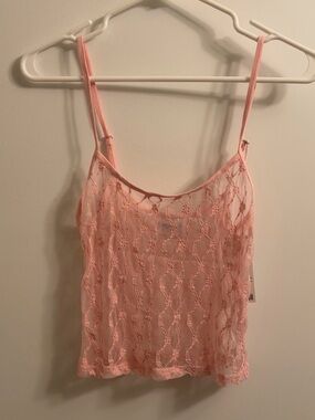 Sheer lace camisole in a soft light pink. Thin adjustable spaghetti straps. Floral-inspired lace pattern across front. Lightweight and breezy for layering. Feminine and delicate silhouette.