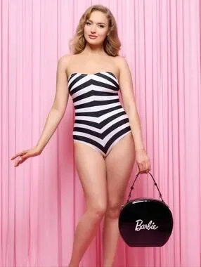 Just in time for summer, the Iconic Barbie Unique Vintage Black & White Chevron Stripe One Piece Bathing Suit in size extra large. Extra support with built in bra at bust. Gently pre-loved, I do not have the optional straps but you can add your own.