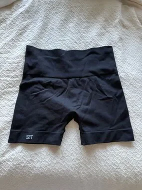 High-waist athletic shorts from SET Active. Stretchy, ribbed sides for movement. Wide waistband for support. Smooth, sweat-friendly fabric. Versatile for workouts or casual wear.