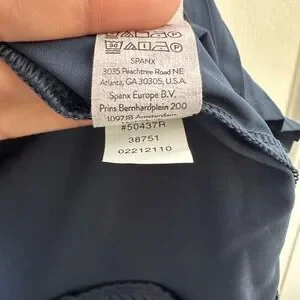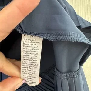 Spanx Yes Pleats Pleated Hem Tee in Navy Blue. This versatile short-sleeve top features a classic crew neckline and a distinctive pleated peplum hem that adds a feminine touch to your activewear or casual wardrobe. Crafted from a comfortable blend of 92% polyester and 8% elastane, it offers a slight stretch and a smooth finish. The navy blue hue makes it easy to pair with leggings or jeans for a polished, sporty look. This item is in excellent pre-owned condition.