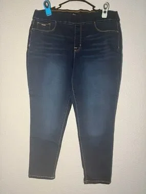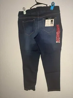 Sleek navy skinny jeans from Nine West. Pull-on waist for easy wear. Stretch fabric offers comfortable movement. Classic five-pocket look with contrast stitching. Versatile navy for everyday outfits.