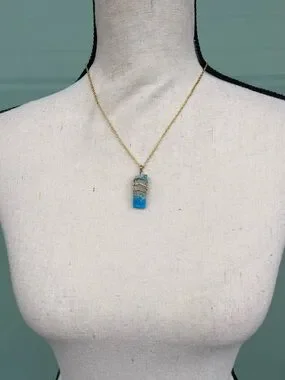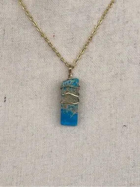 Blue Rectangular Stone Pendant Necklace with Gold Wire Wrap