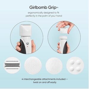 Conair Girlbomb shaver and body polish kit for smooth, touchable skin. Includes a 3-in-1 shaver and multiple polish attachments for gentle exfoliation and targeted smoothing. Designed for easy use and quick results. Color: white and black.
