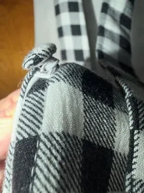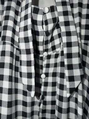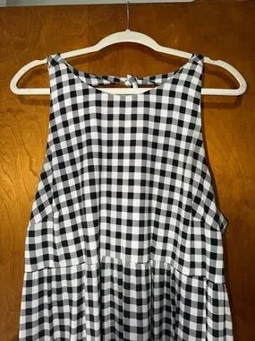 Sleeveless maxi with a high, rounded neckline. Tiered skirt for flowing movement. Lovely decorative back button detail. Halter style neck strap that can be tied and adjusted depending on how you would like to style. Classic gingham check in contrasting tones. Easy, breezy silhouette for everyday wear. Please note- top button elastic is loose and has been secured by twisting over itself a few times and will stay secured that way.