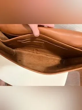 Classic tan leather messenger &laptop bag with adjustable shoulder strap and top carry handle. Features secure front brass buckle closures and polished hardware for a refined look. Slim, structured design for everyday work and travel. Versatile tan color pairs well with professional and casual outfits.