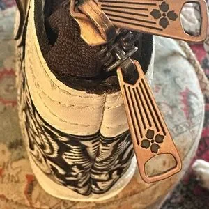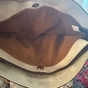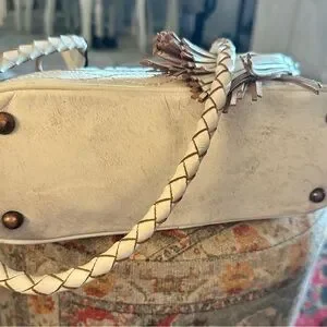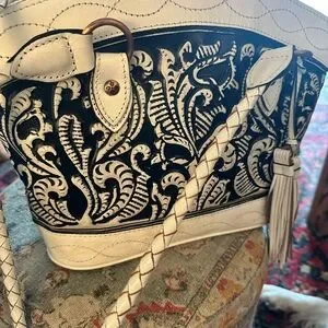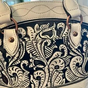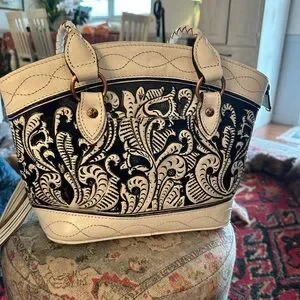 Patricia Nash tote with intricate black embossed scrollwork on white leather.