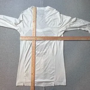Nike NFL On Field Apparel Houston Texans long sleeve performance shirt in white. This technical top features a breathable mesh-like texture throughout with specialized chevron-patterned ventilation panels on the back for maximum airflow. It includes the Houston Texans logo on the chest, a Nike swoosh, and an NFL shield on the sleeve. Designed with a slight drop tail hem and side slits for mobility, this piece is crafted from a high-performance polyester and spandex blend, making it ideal for training or game day layering.