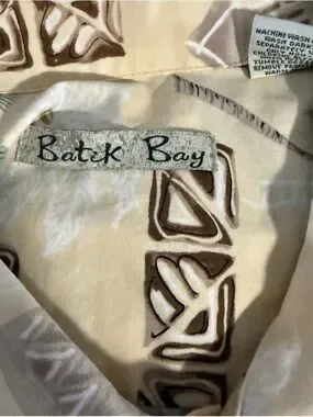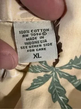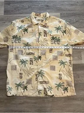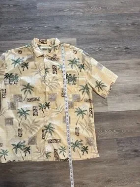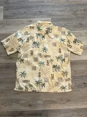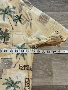 In excellent condition-Men’s size XL Batik Bay Hawaiian Lightweight short-sleeve shirt with a cream base and green palm print. Comfortable button-front design for casual wear. Easy to pair with shorts or chinos for a relaxed, tropical look. Includes green palm accents throughout the cream fabric.