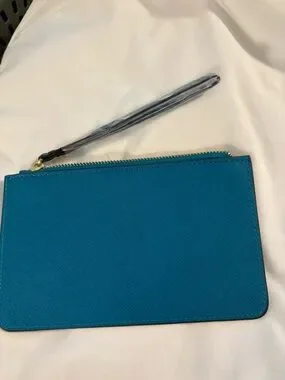 Compact wristlet in a bright teal textured leather. Gold Kate Spade logo and zipper accent. Simple, elegant carry for cards and small essentials.